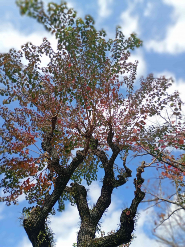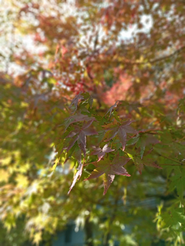 祈念館と資料館の間の中庭にあるモミジも、色づき始めました。
