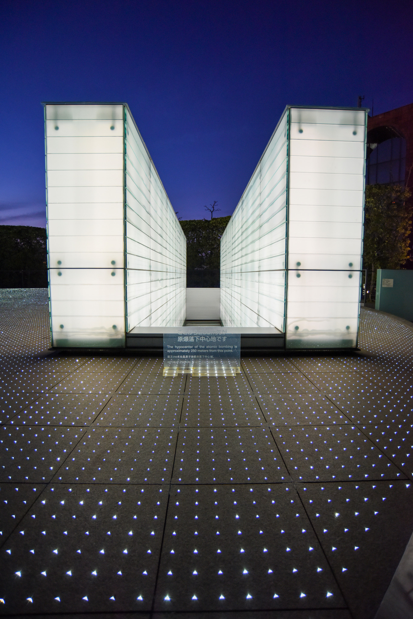また、夕刻になると、水盤の底に埋め込まれた約7万個の光ファイバーが点灯されます。この明かりは、原爆で亡くなられた人々の数(1945年12月末までの推定死没者数)を表すと同時に、原爆によるすべての犠牲者にささげることを意図しています。