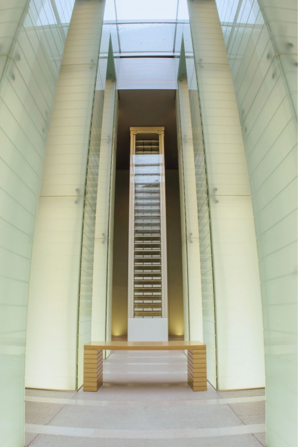 『追悼空間』の奥まで進み、爆心地の方向に向き直っていただくと、12本の光のガラスの柱の奥に、原爆死没者名簿を安置している名簿棚を見ることができます。