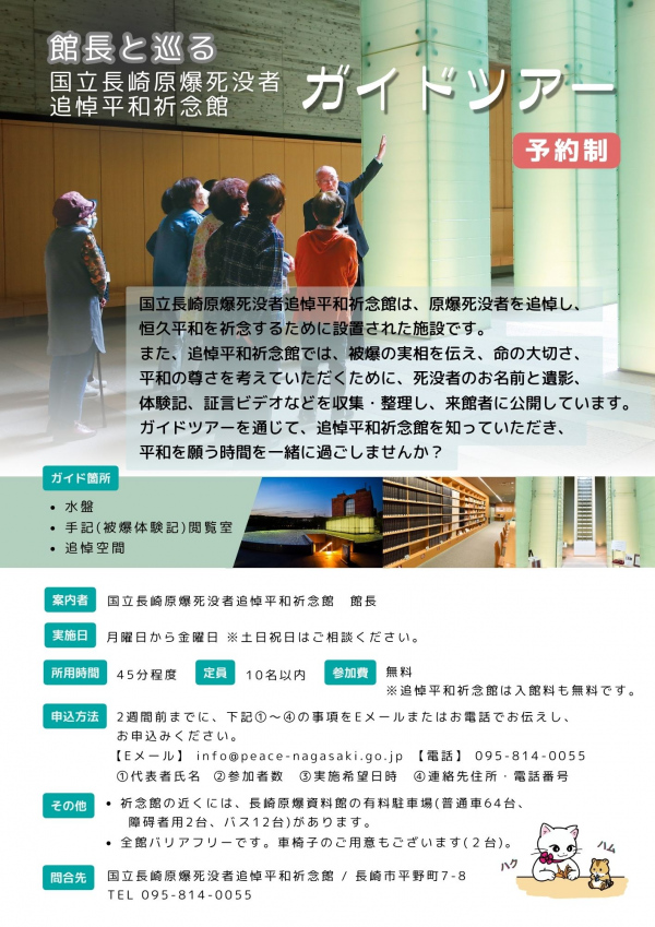 「館長と巡る追悼祈念館ガイドツアー」は、いつでも開催可能です。多くの方々に平和について考える機会づくりとしてご活用いただければ幸いです。